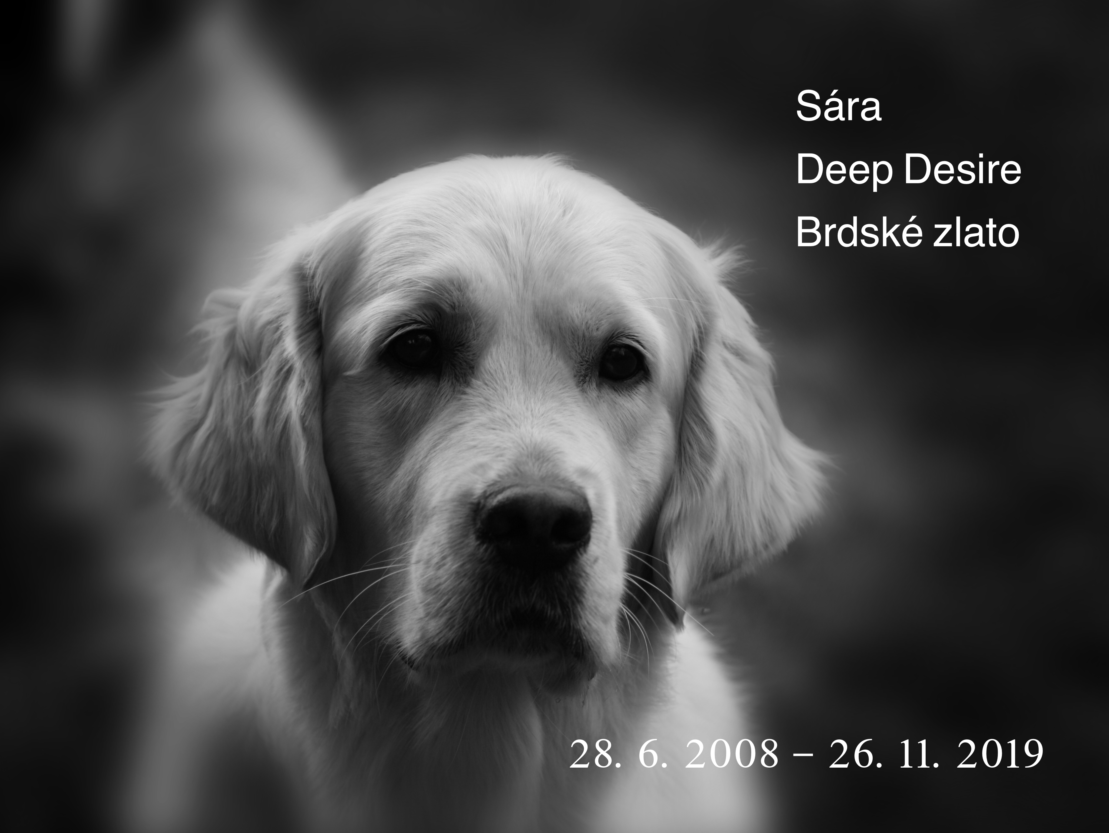 26. listopad 2019 je pro nás jeden z nejsmutnějších dnů. Po krátké nemoci nás opustila naše nejmilovanější Sárinka - Deep Desire Brdské zlato. V mém srdci a vzpomínkách zůstaneš navždy.